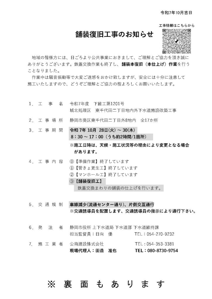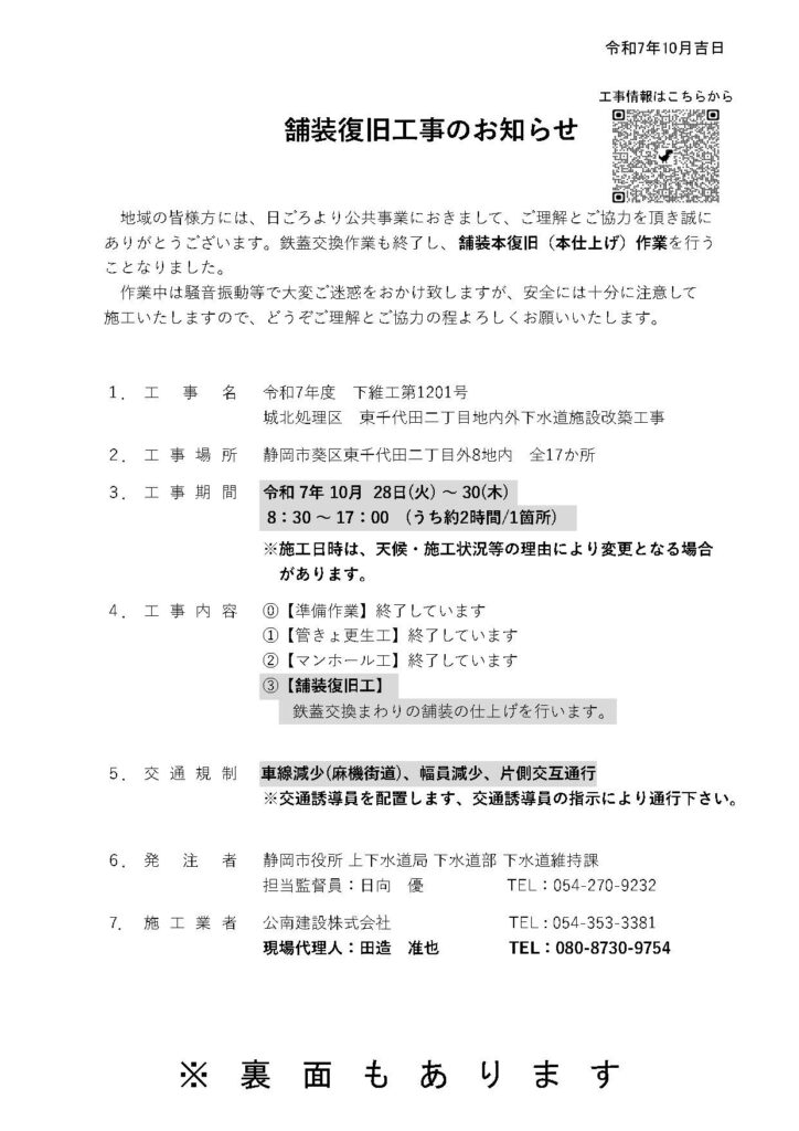 さて、この舗装復旧工事を下記日程・場所で行います。皆様方には大変ご迷惑をおかけいたしますが、安全に十分注意し実施いたしますので、どうぞよろしくお願いします。